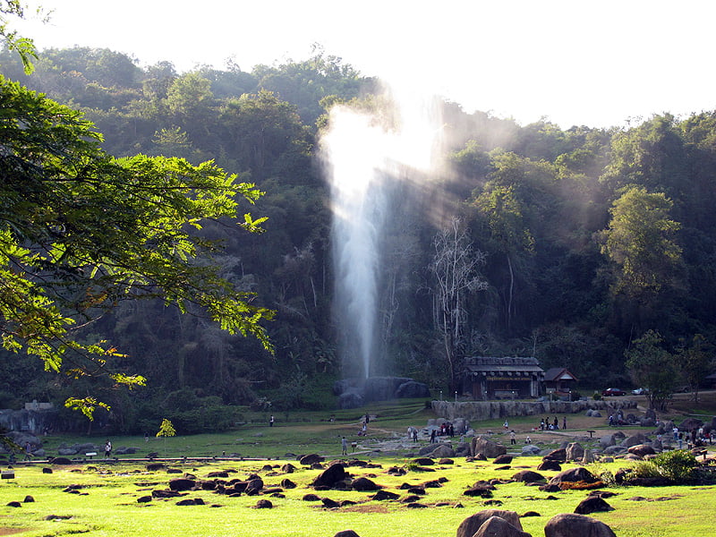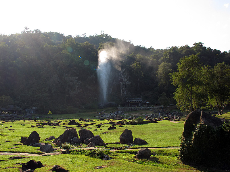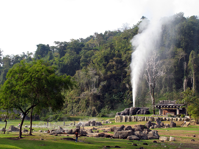 Dit Thaise gebied kent zelfs een eigen versie van de ‘Old Faithful Geyser’ in Yellowstone. Ongeveer elk uur blaast de Thaise variant hete stoom 40 tot 50 meter de lucht in, een indrukwekkend schouwspel. In de koele uren van de ochtend is het thermaal gebied gehuld in stoom, terwijl enkele kleinere geisers voortdurend stoom afblazen. En dat in een tropisch land…